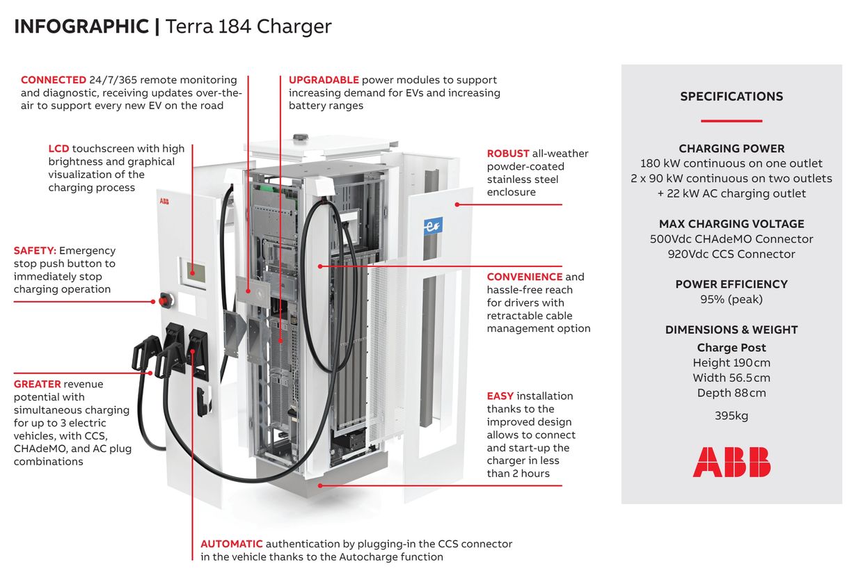 ABB's Terra DC fast chargers are designed for quick, convenient charging of all electric vehicle models, including those equipped with high- voltage battery systems. The Terra’s compact size makes it perfect for public and fleet use, while its modularity allows an increase of charging power up to 180 kW and serves up to three electric vehicles at the same time.